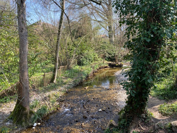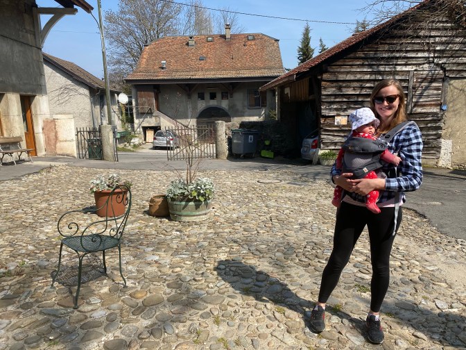 The path was not completely smooth, but our pushchair survived! The chemin soon opened out onto a flatter road and we crossed over Route de Troinex and found a small gravel path across La Drize. We kept following the yellow path and it eventually led us into Troinex.