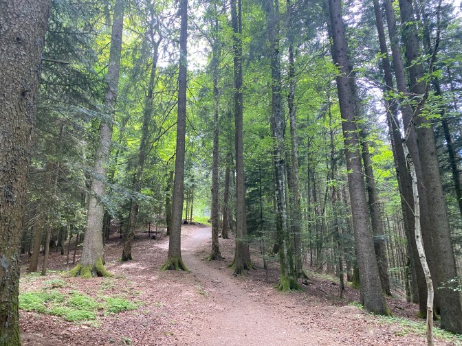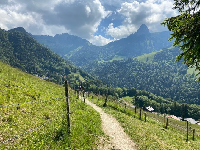The path continues to the Cubly viewpoint, where there is a 360 degree panorama from the Jura to the Chablais, as well as Lake Geneva. Another great spot to have a rest and soak up the scenery. After this the path descends steeply (with the help of steps) down through the forest until it reaches a small track/road, where the path begins to loop back round. After a brief walk on this small road, the path takes you up again into another part of the forest and the walk continues through this forest until it opens out again and leads you back into Les Avants.