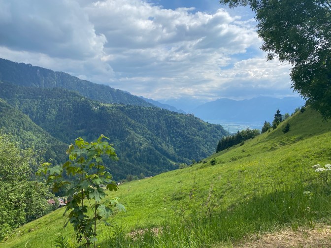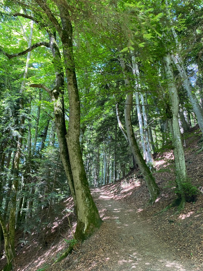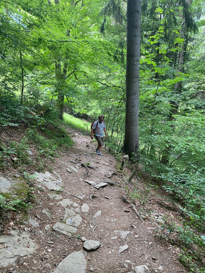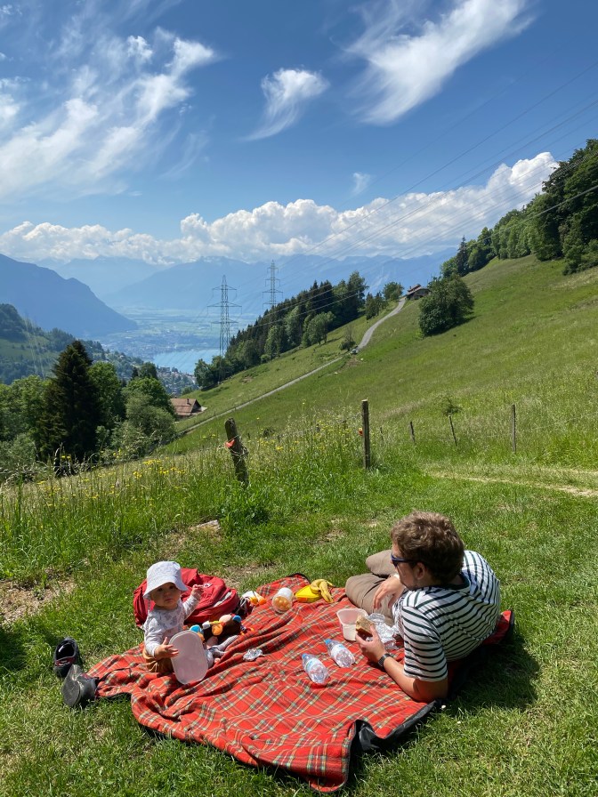 Once we reached the top, the path became wider and flatter, passing through forests and meadows with pleasant view points. We stopped for a snack and to enjoy the views. We saw a few other young families with babies and children in carriers and backpacks! This walk is famous for seeing the meadows covered in narcissi in May. However, we went in late May and they seemed to have gone, but it didn’t matter, the views were still incredible!
