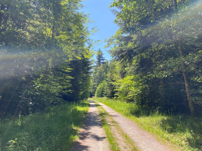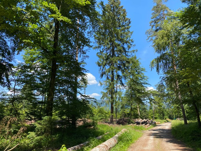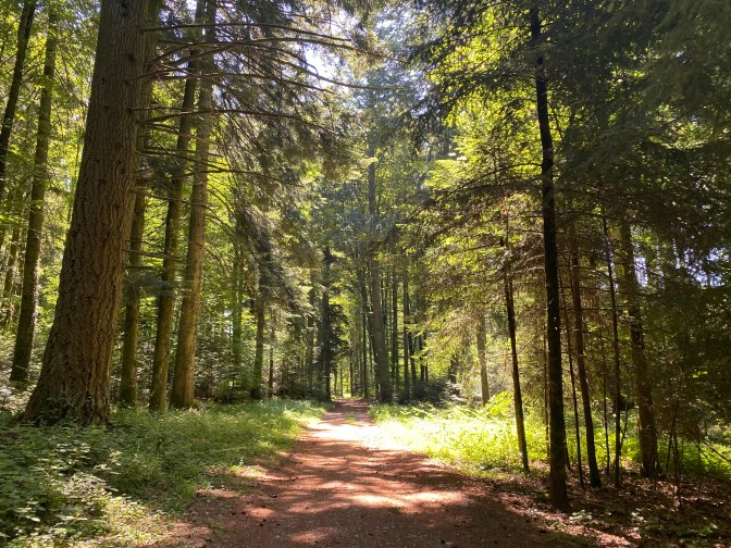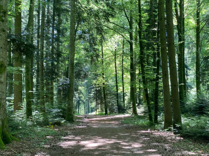 We followed the 3.6km path on a circular route through the forest. The path was wide and mostly flat. The sun shone beautifully through the trees and we could see the Jura mountains behind the forest. As it was a very hot day, we appreciated the shade from the forest and Jack enjoyed the different sights, sounds and smells.