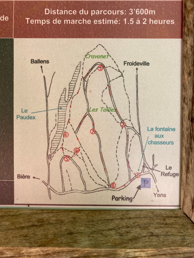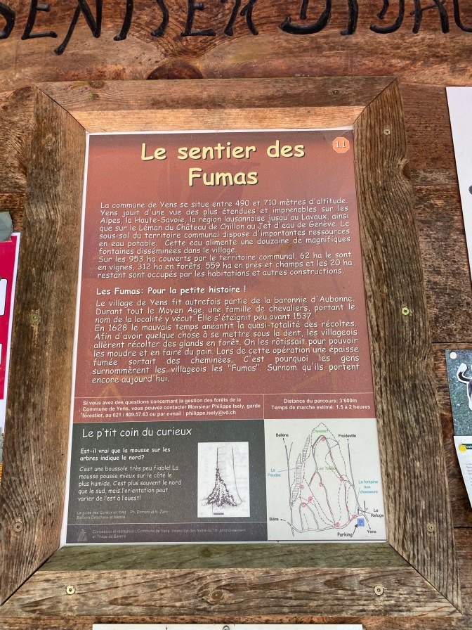 After our picnic we headed into the forest to begin ‘Le Sentier des Fumas’ or the Fumas path in English. It is called this because in the 17th century, all the crops were destroyed because of bad weather in the region. The people of Yens resorted to collecting acorns in the forest, which they roasted and ground to make bread. During this task, thick smoke came out of their chimneys. That is why people nicknamed the villagers of Yens “Fumas” – and they are still called this today.