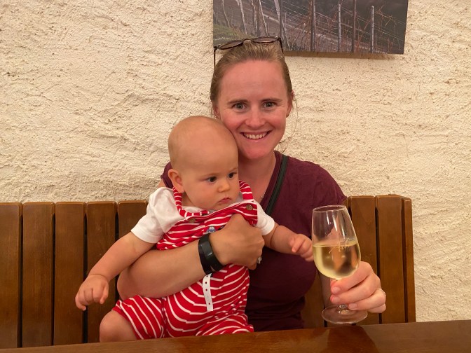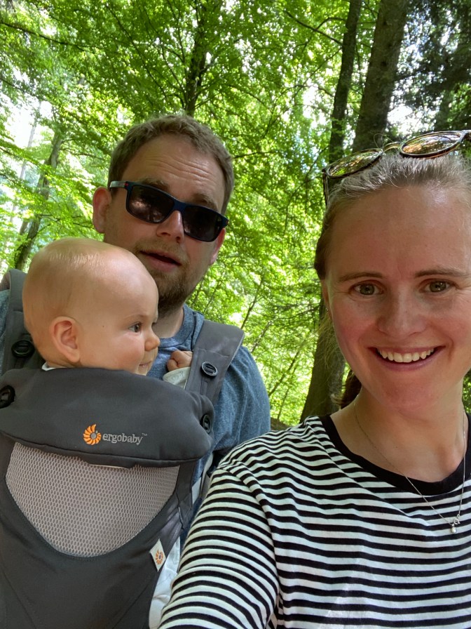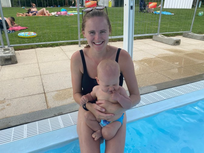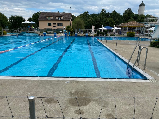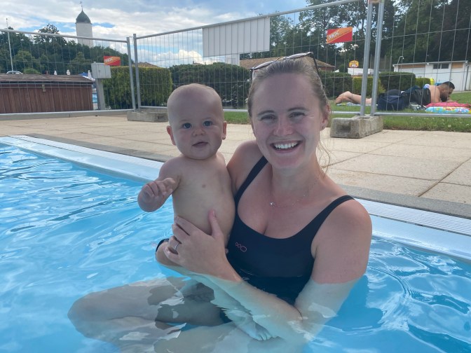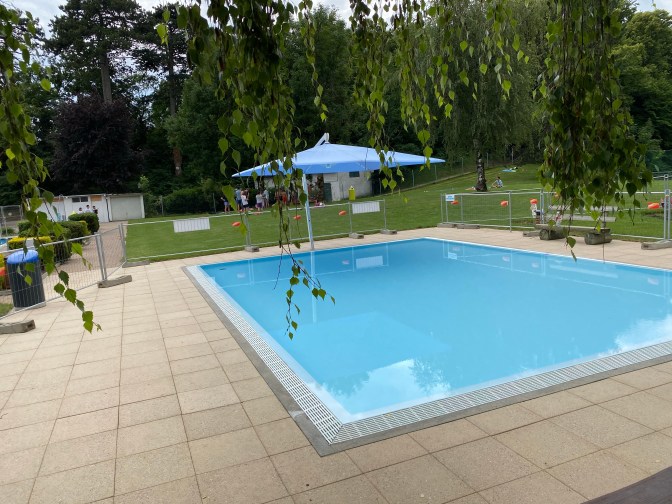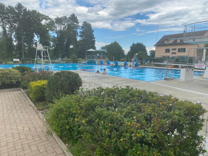 As we were nearing the end of this bridleway we spotted a public outdoor swimming pool – piscine d’Aubonne. So we headed straight to it – it was 4 chf for the entrance and it had a large swimming pool and a lovely baby pool with shade! It was such a relief to cool off and Jack loved swimming in the water and waving at other babies!