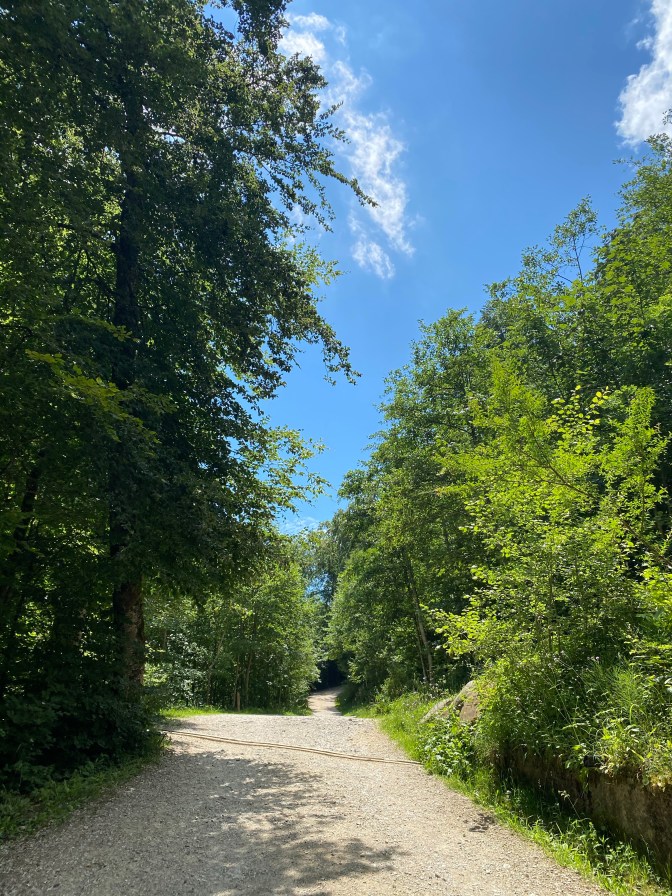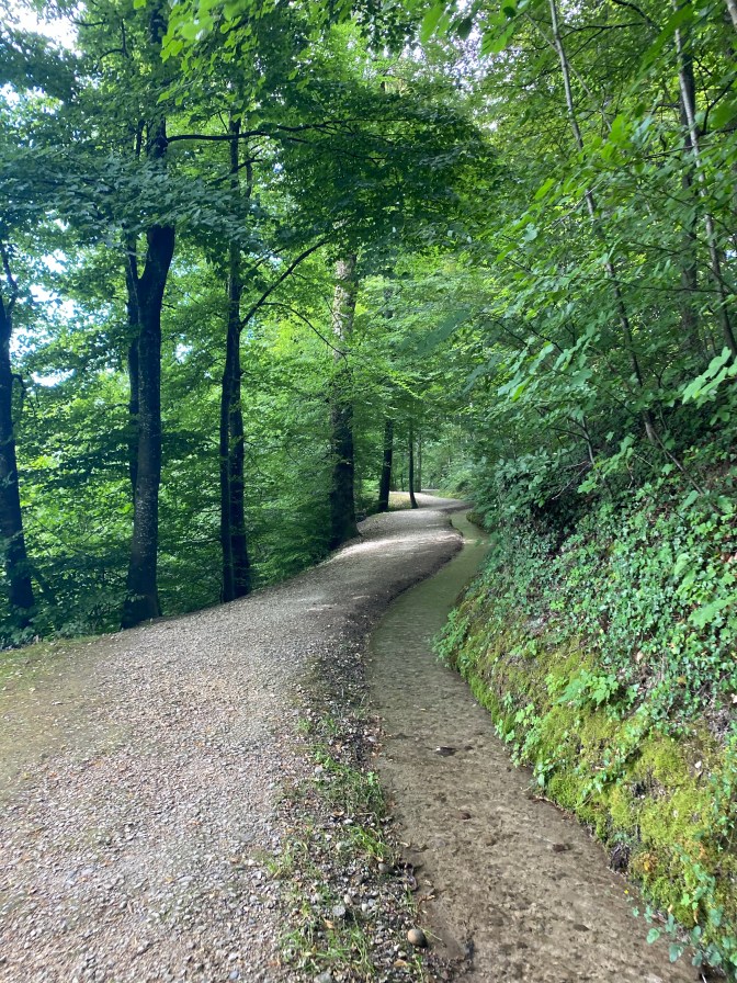 After about half an hour the path went into a forest alongside L’Aubonne river. This part of the walk was tricky; it was not appropriate even for the all terrain pushchair because it was very up and down with lots of big tree roots. We followed this path, but in hindsight, we should have walked along the little country lanes.