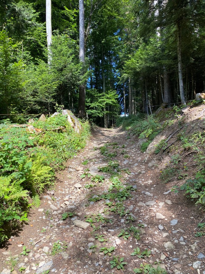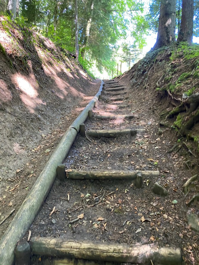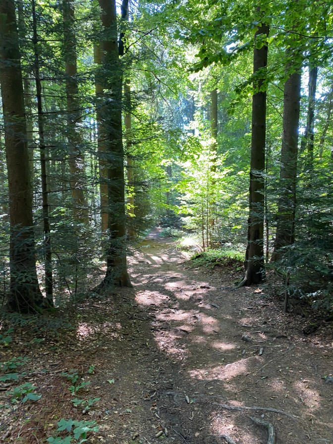 The path takes you uphill very quickly and there are steps to help you gain height. Luckily a lot of the path is through forests, so there is shade on a hot day for the majority of the walk. It also takes you along some beautiful meadows that overlook Lac Leman and across into Canton Freiburg in the other direction.