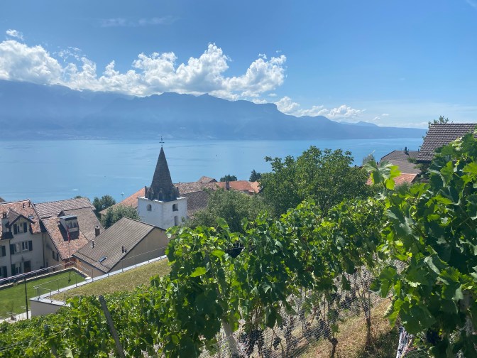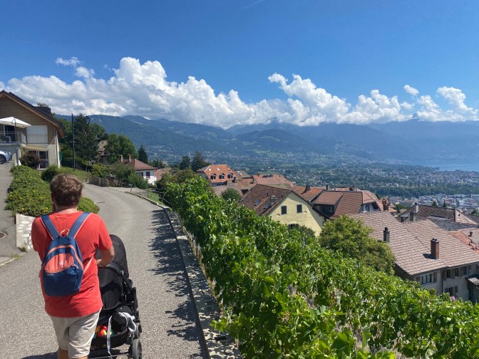 We hiked back down, (which was a lot quicker than on the way up!), and Jack fell asleep in the carrier as we headed down. We picked up our pushchair and walked downhill to Chardonne, which is a beautiful village surrounded by vineyards, with stunning views over Lac Leman and the mountains.
