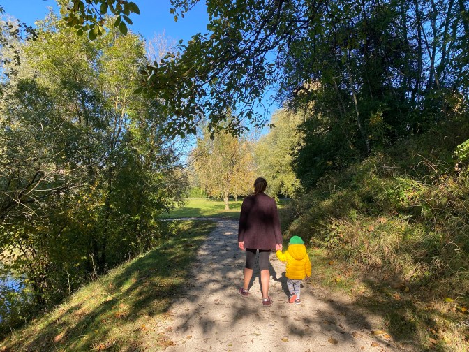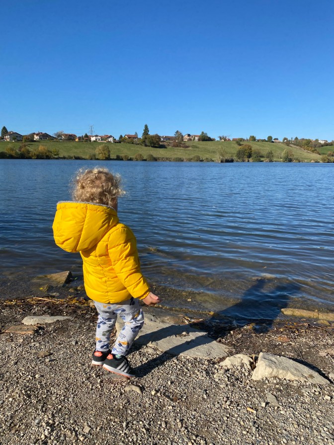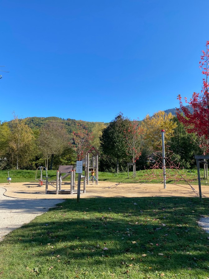 Our son loved exploring though and we had a great time wandering around the lake. We started by the place de jeux (play area) – this play area is mostly designed for older children, but there were some things that our 2 year old could access. There are plenty of benches and picnic benches as well.
