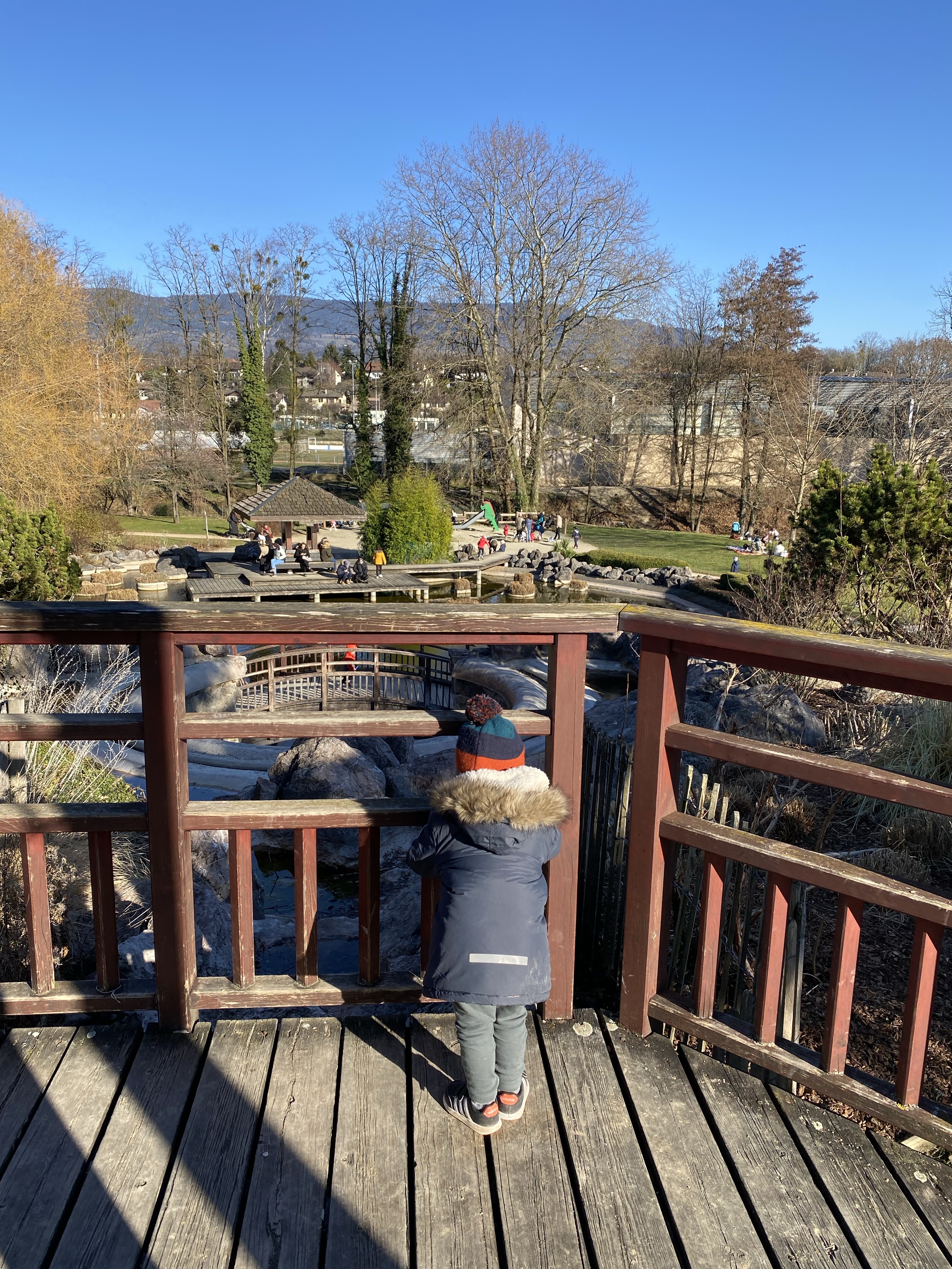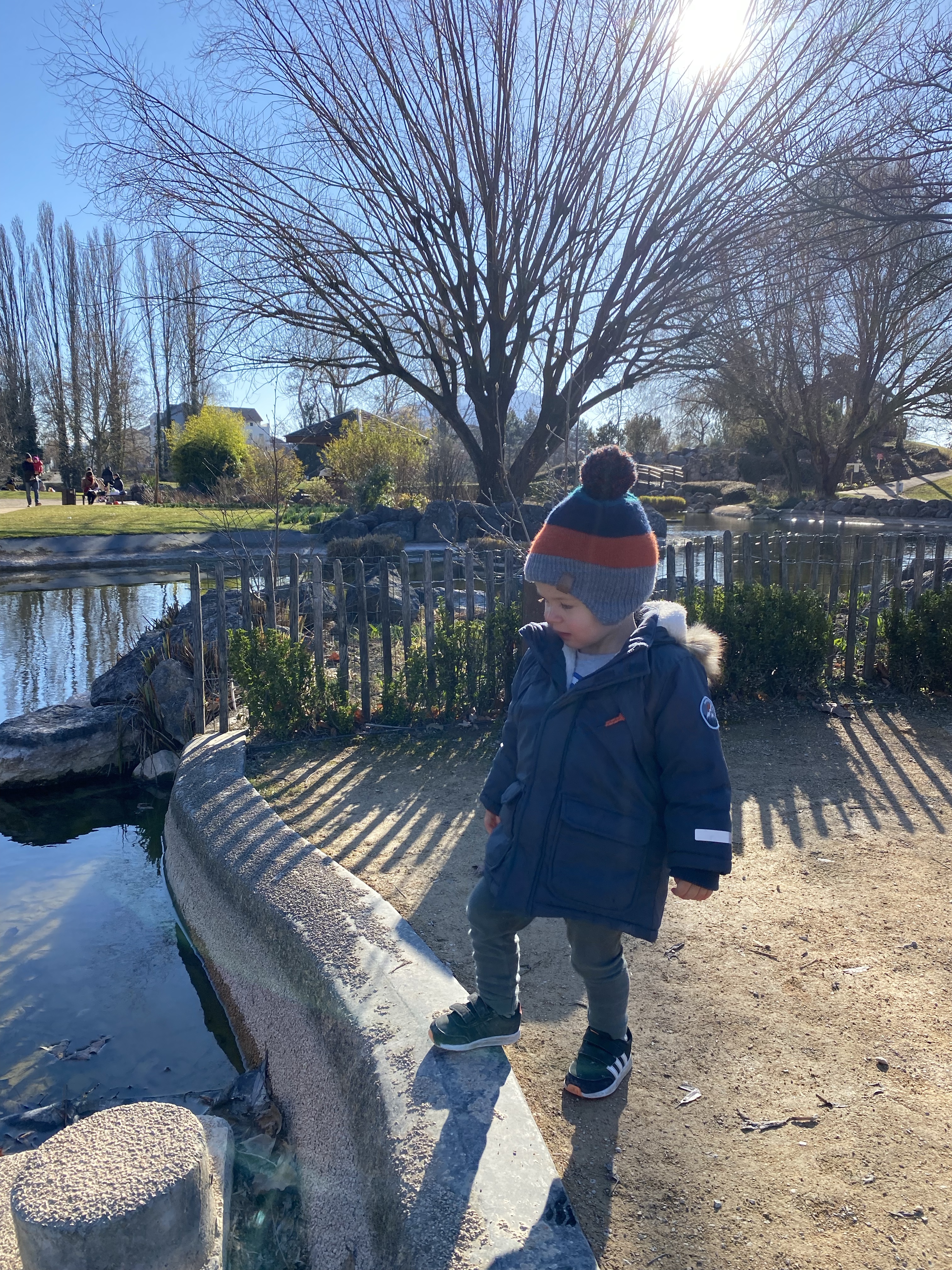 Our son loved scooting around and playing on the climbing frames. A particular highlight for him is that a train line runs alongside the park and he was able to see trains whizzing by. He also loved the stepping stones over the water onto small islands.